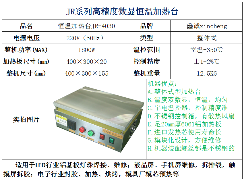 JR-4040(加热板尺寸:400×400×20mm,整机尺寸:400×400×150mm),功率:2200W,重量:13Kg,使用温度:室温-350度