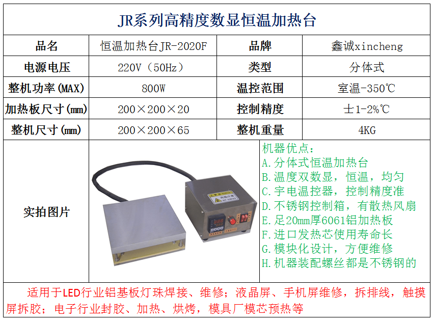 JR-2020(加热板尺寸:200×200×20mm,整机尺寸:200×200×150mm),功率:800W,重量:5Kg,使用温度:室温-350度