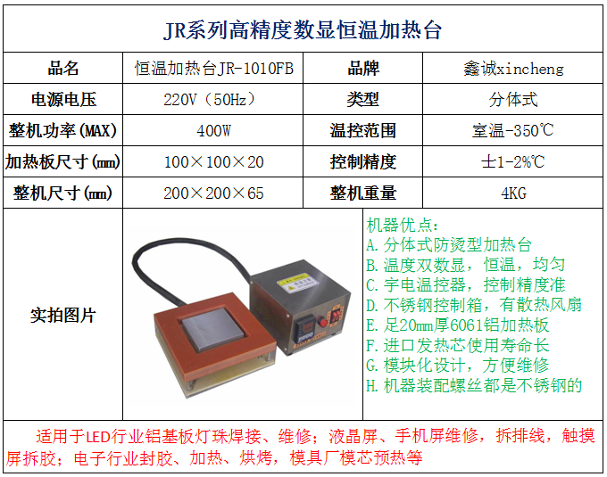 JR-1010(加热板尺寸:100×100×20mm,整机尺寸:200×200×150mm),功率:400W,重量:3.5Kg,使用温度:室温-350度