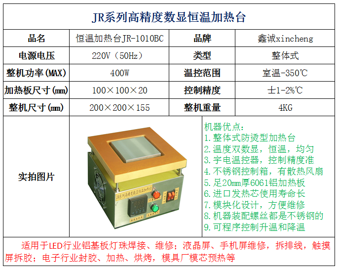JR-1010(加热板尺寸:100×100×20mm,整机尺寸:200×200×150mm),功率:400W,重量:3.5Kg,使用温度:室温-350度