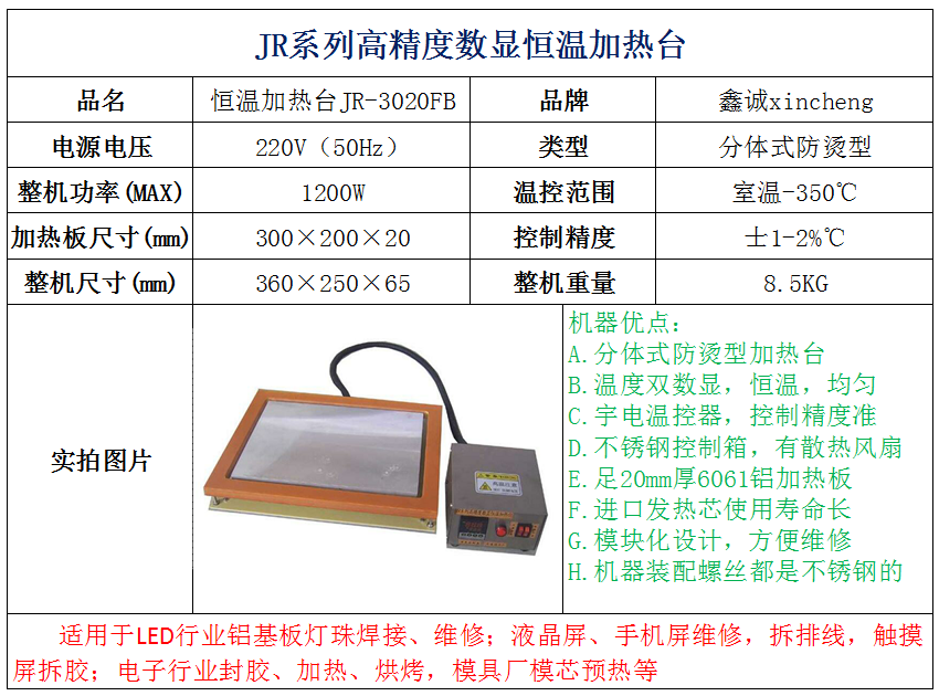 JR-3020(加热板尺寸:300×200×20mm,整机尺寸:300×200×150mm),功率:1200W,重量:7Kg,使用温度:室温-350度